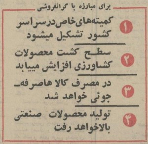 شاه همچنین از تشکیل «کمیتههای خاص مبارزه با گرانی» در سراسر کشور خبر داد و «هشدار» داد که اگر این اقدام منجر به کاهش قیمتها نشود، «ممکن است دستور دهیم این کار بهطریق بسیار شدیدی توسط نیروهای انتظامی انجام شود».